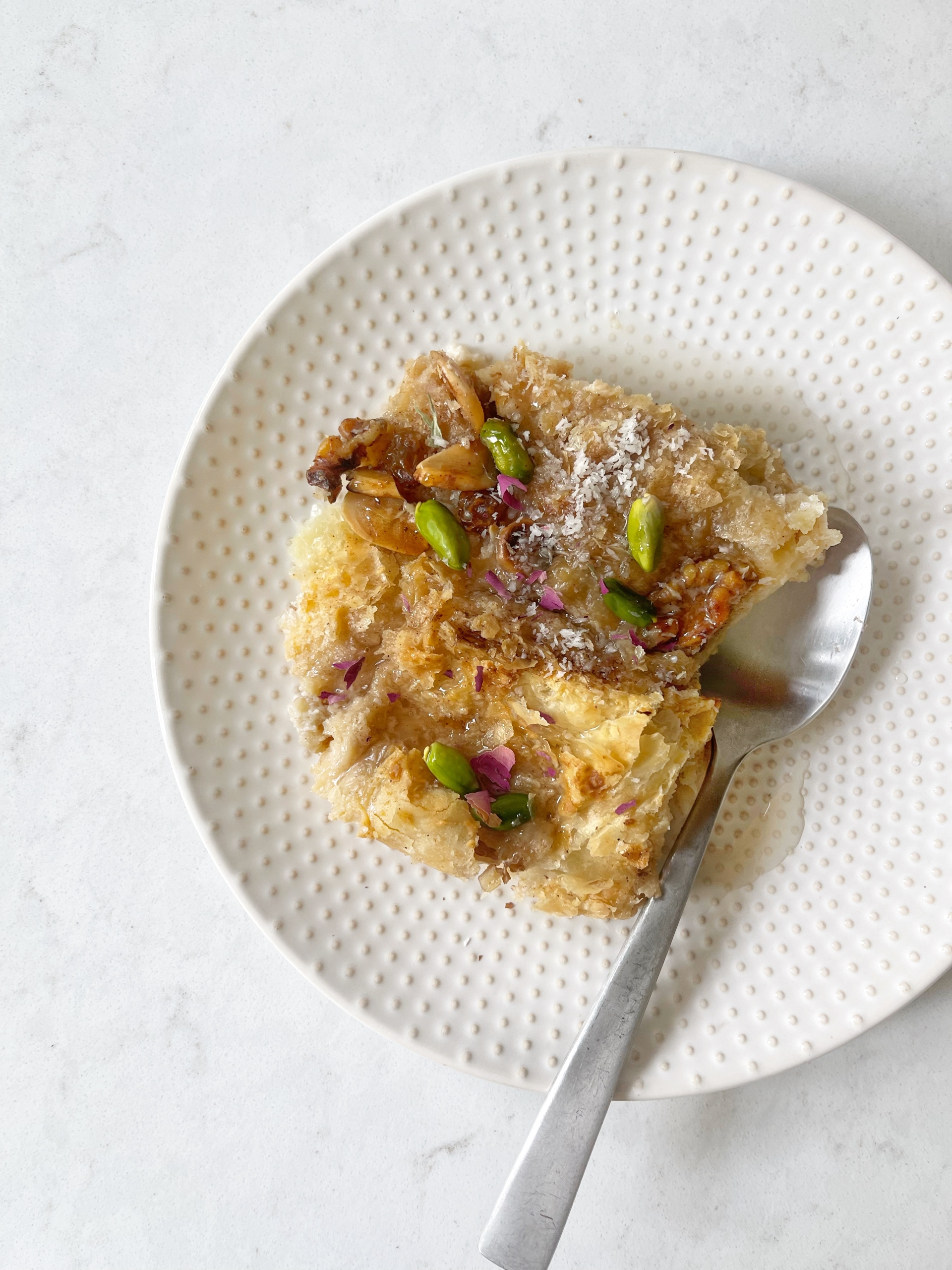 A beloved Egyptian bread pudding–style dessert featuring flaky pastry baked with sweetened milk, nuts, and coconut. Rich, warm, and often served on special occasions.