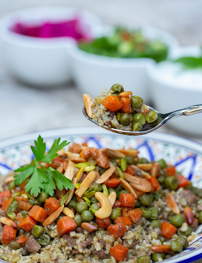 Spread a layer of the lamb and freekeh pilaf on a platter, top it with a layer of carrots and peas then sprinkle it with your favorite fried nuts. Garnish with some chopped parsley and serve it warm with a side of salad and yogurt.