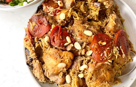 Makloubeh is a beloved Palestinian rice dish layered with tender chicken and vegetables, then turned upside down to reveal a stunning, savory centerpiece. Rich in flavor and tradition.