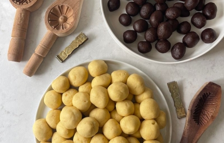 Place a dough ball in the palm of your hands and flatten it slightly into a disc a bit larger than the date filling. Place a date ball in the middle and wrap the dough around it until you don’t see the date filling anymore. Roll between the palms of your hands creating a ball.