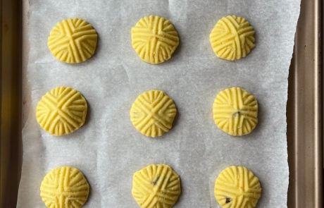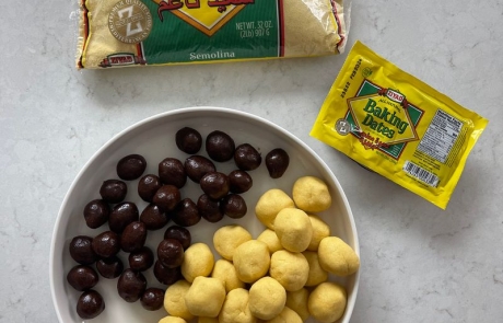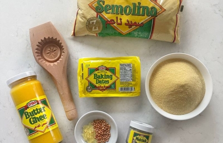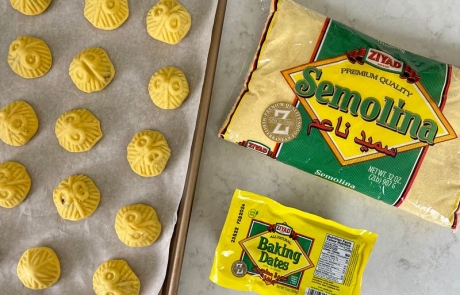 In a large bowl mix together semolina, ghee, mastic and Mahlab. Using your hands to combine all the ingredients until it’s well mixed and resembles wet crumbs. Cover with plastic wrap (so dough doesn’t dry out) and let it sit on the counter overnight or for a few hours.