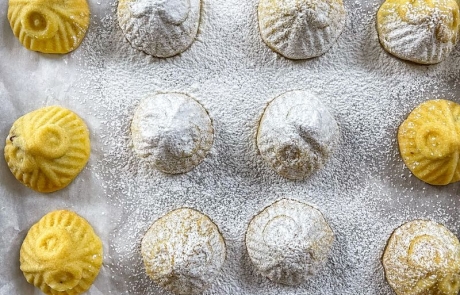 Traditional mamoul cookies made for Eid, filled with dates and scented with gentle aromatics. A beloved treat for holidays and special gatherings.