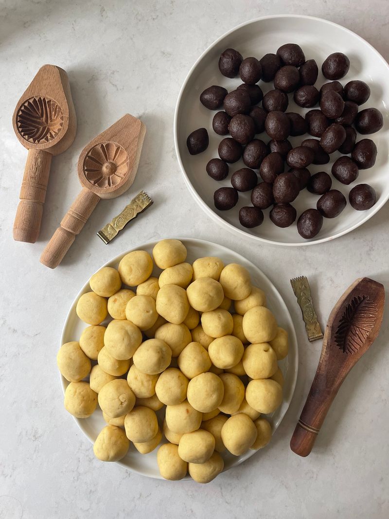 Oil your hands with a bit of ghee and shape the date paste into equal size balls about 1/2 the size of the dough balls. Set aside on a tray and cover with cling wrap until you are ready to use so the dates don’t dry out.