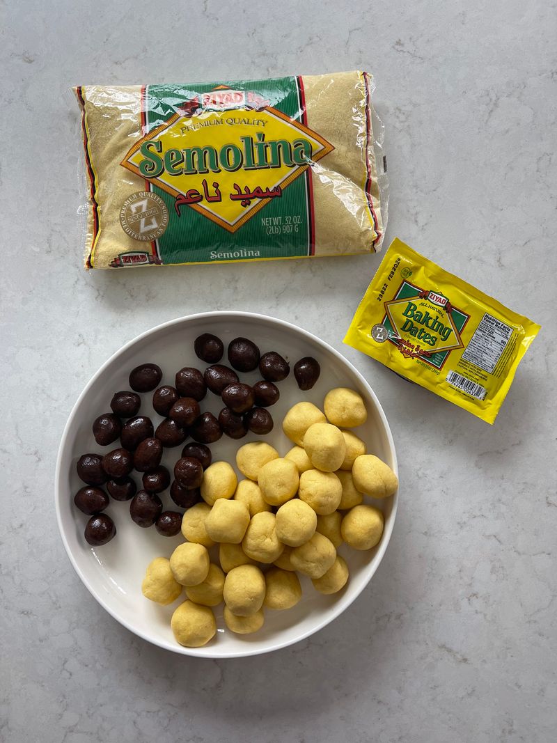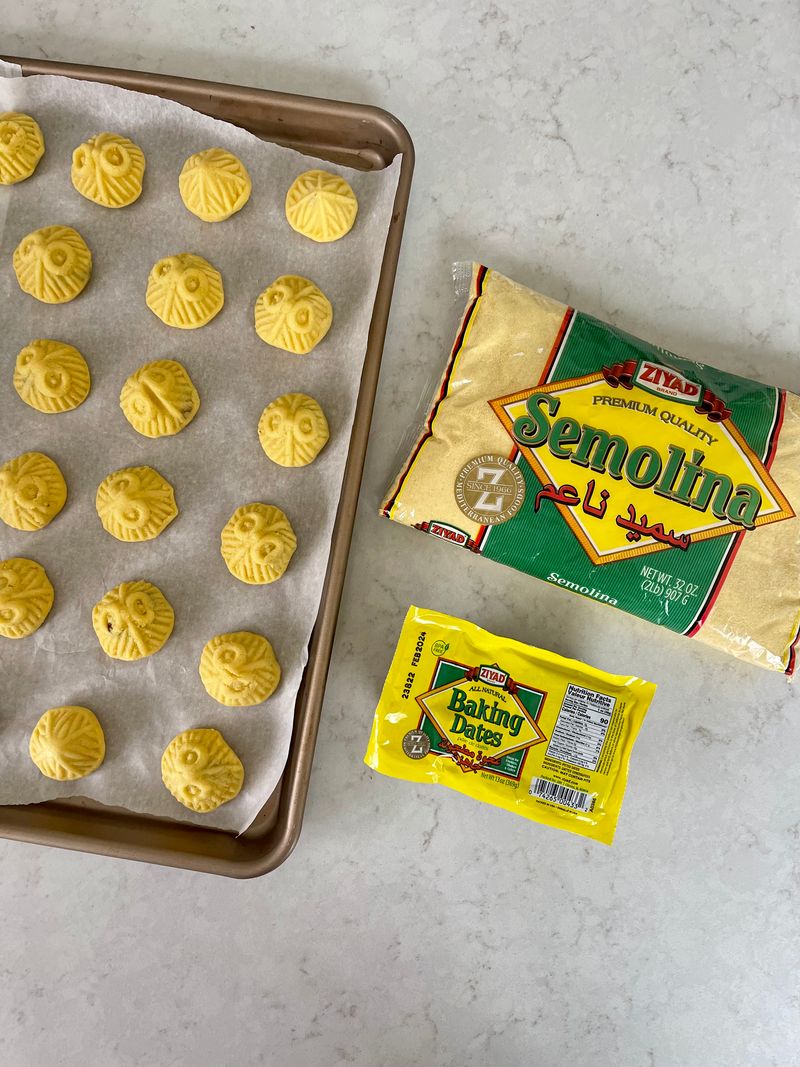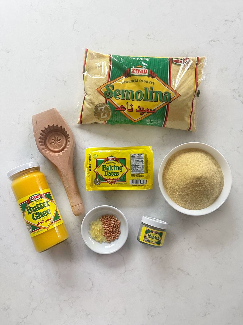 In a large bowl mix together semolina, ghee, mastic and Mahlab. Using your hands to combine all the ingredients until it’s well mixed and resembles wet crumbs. Cover with plastic wrap (so dough doesn’t dry out) and let it sit on the counter overnight or for a few hours.