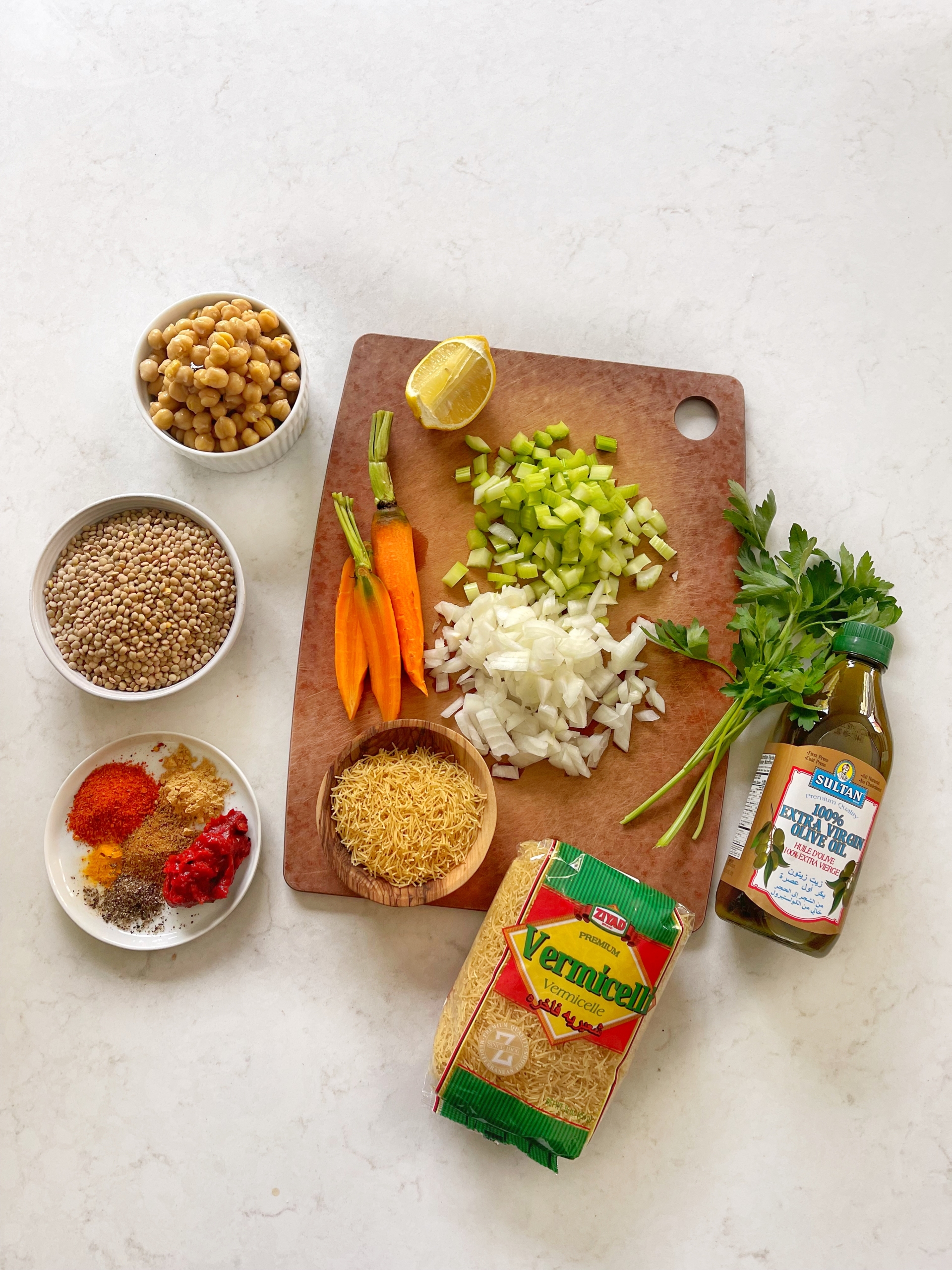 Heat the oil in a large skillet over medium heat and sauté the onion, celery, and carrots until the onion turns translucent and begin to brown, about 5 to 10 minutes. Add all the spices, half the amount of the chopped parsley and cilantro, crushed tomatoes, tomato paste, and the stock or water and bring to a boil. Simmer uncovered for 25 minutes, then add the lentils, and chickpeas, and vermicelli noodles, salt and pepper and continue simmering until the lentils and noodles are cooked, about 20 more minutes.