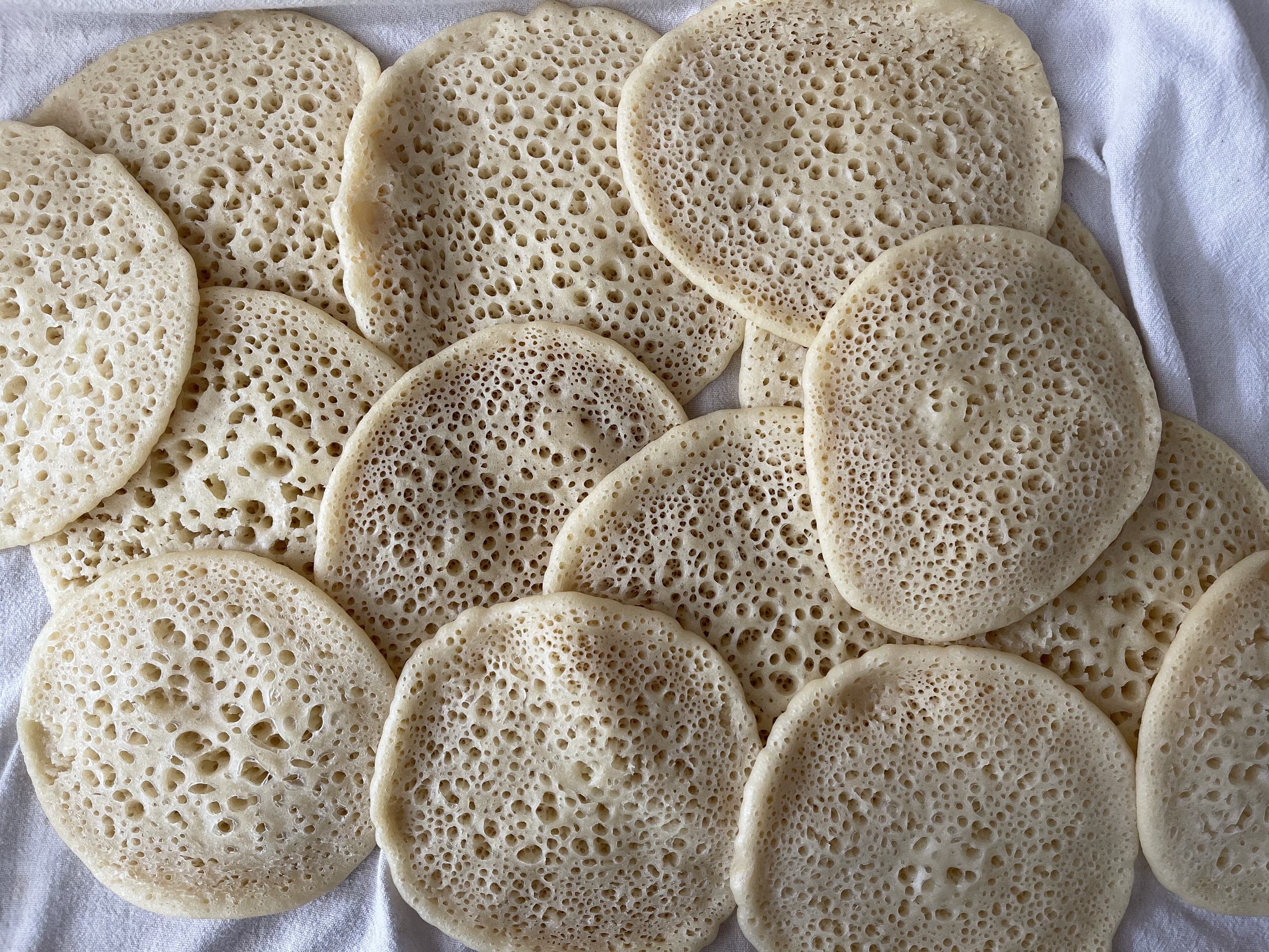 With Qatayef, unlike pancakes you only need to cook them on one side. So you will notice that the surface will start forming bubbles. Once the bubbles are set and no longer wet your atayef is ready.