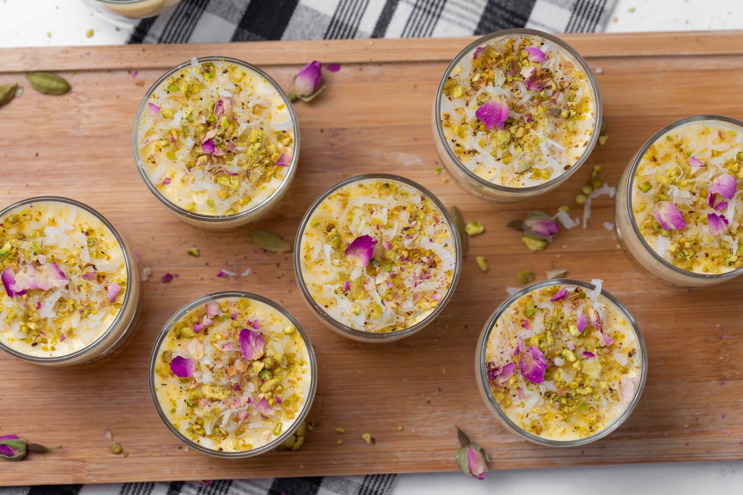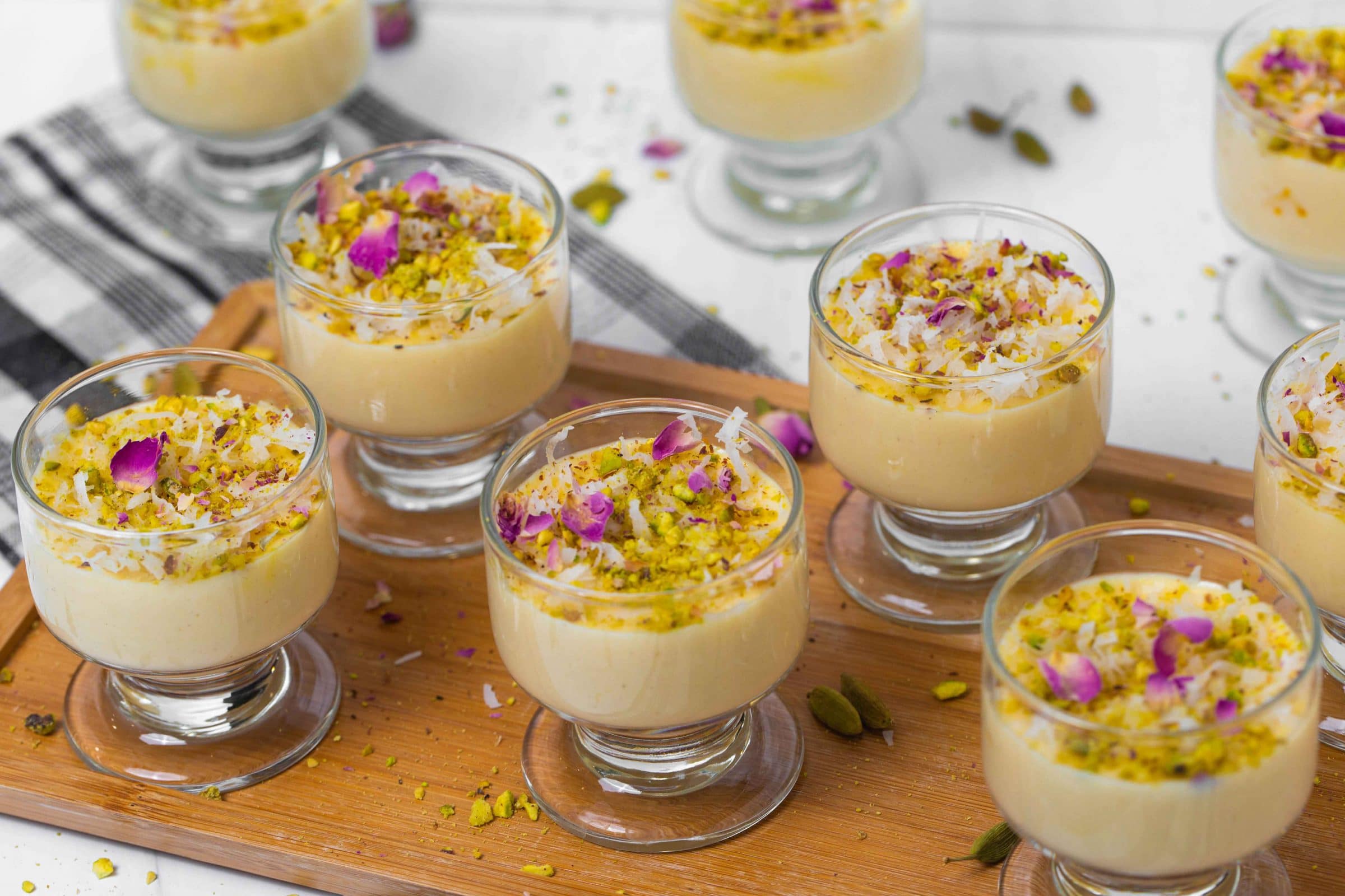 Cover it with plastic wrap making sure the wrap is touching the surface of the custard. You could also use coconut and pistachios to cover the surface of your dessert. Before serving, top your plate with rose petals.