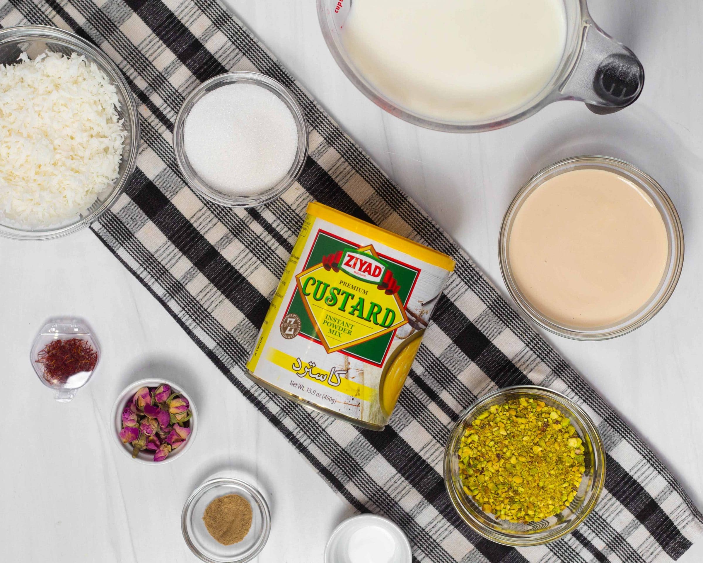 In a small bowl, add the rose water on top of the saffron strands and set aside. In a saucepan, mix the milk, sugar, cream, and custard powder and cook over medium heat while constantly mixing.